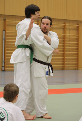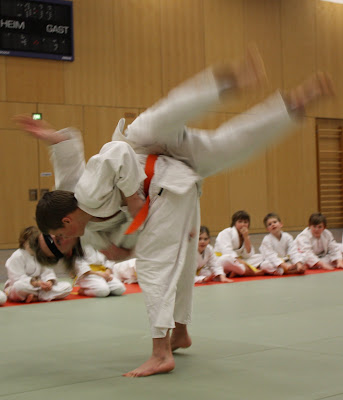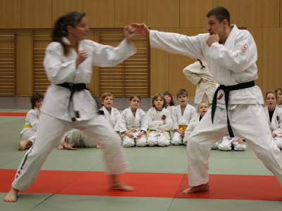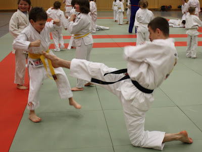 Nach dem gemeinsamen Aufwärmen teilten die Referenten die teilnehmenden Kinder altersgerecht in zwei Gruppen auf (7-9 Jahre und 10-14 Jahre). Nun lernten die Kids in einer ca. einstündigen Einheit tolle Kombinationen. Sie enthielten Abwehr- und Störtechniken, Wurf-, sowie Festlegetechniken. Alle trainierten mit großem Eifer und Fleiß und auch der Spaß kam nicht zu kurz.